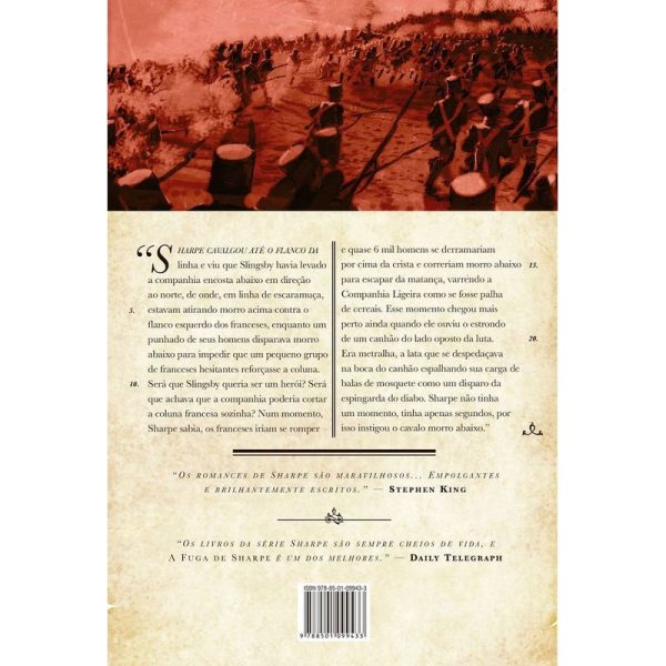 O 10° volume da série As aventuras de Sharpe Em 1810, o capitão Richard Sharpe está em Portugal e comanda a Companhia Ligeira do Regimento South Essex contra as forças napoleônicas. Sharpe vê com muita fúria os esforços de seu superior, o tenente-coronel Lawford, de fazer o próprio cunhado, o atrapalhado e inapto Slingsby, destacar-se na companhia. Além disso, para complicar ainda mais a situação, Sharpe cria uma inimizade com um comerciante de Coimbra, Ferrabrás, de quem desconfia, com razão, tratar-se de um traidor que planeja vender suprimentos para o exército inimigo. Ferrabrás é um homem extremamente violento que se aproveita da posição de seu irmão, o major Ferreira, assim como da governanta dele, a inglesa Sarah Fry, a quem deseja intensamente. A rivalidade com o português coloca Sharpe em maus lençóis, especialmente quando o obstinado inglês cruza o caminho da Srta. Fry e se transforma em seu protetor. Com a companhia dos fiéis amigos, o sargento Patrick Harper e o capitão Jorge Vicente, Sharpe ajuda a Srta. Fry, e eles precisam sobreviver à armadilha tecida por Ferrabrás e chegar até o restante das tropas inglesas, que se preparam para enfrentar os franceses na Serra do Buçaco. A experiência de Sharpe será decisiva, pois a batalha que se aproxima irá colocar o melhor dos dois exércitos frente a frente.