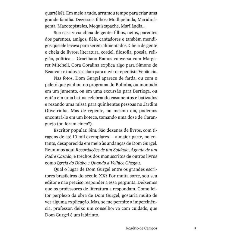 Um dos grandes enigmas da literatura brasileira do século XX, Dom Gurgel publicou dezenas de livros e vendeu milhares de exemplares em uma rede totalmente alternativa, sem ser notado pela academia nem pelo circuito comercial. Agonia de um padre casado reúne histórias em que ele confessa seus pecados, suas angústias, suas bebedeiras e suas ressacas. Sempre com um humor surpreendente. Preso e torturado pela Ditadura Militar, Dom Gurgel teve seu momento de celebridade televisiva quando apareceu no programa do Sílvio Santos comendo grilos para, com o dinheiro do cachê, reerguer sua igrejinha do Jardim das Oliveira (zona sul de São Paulo) que havia sido destruída por uma tempestade. O livro traz histórias que narram, em tom de cordel surrealista, o cotidiano de um quartel no Rio Grande do Norte, as agruras de um religioso em crise com sua fé e as desventuras de um padre com 16 filhos para criar.