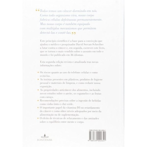 Médico francês ensina a prevenir a doença usando defesas naturais. Mais de 300 mil exemplares vendidos na França. Publicado em mais de 26 países. Como todo organismo vivo, o corpo humano fabrica células defeituosas permanentemente. Mas é o próprio organismo, também equipado com múltiplos mecanismos, que permite detectá-las e contê-las. Este princípio científico é a base que ajudou o médico e pesquisador David Servan-Schreiber a superar o câncer e, em seguida, escrever o livro Anticâncer, que se tornou o mais vendido no mundo sobre o assunto. O autor não fala somente como pesquisador. Em 1981, quando tinha apenas 30 anos, Servan-Schreiber teve câncer no cérebro. Foi tratado pelos métodos convencionais, e depois teve uma recaída. Foi então que decidiu pesquisar, para além dos métodos habituais, tudo que podia ajudar seu corpo a se defender. Na qualidade de médico, pesquisador e diretor do Centro de Medicina integrado à Universidade de Pittsburgh, nos Estados Unidos, teve acesso a informações preciosas sobre as abordagens naturais que podem contribuir para prevenir ou tratar o câncer. Em Anticâncer, Servan-Schreiber faz o relato de tudo o que aprendeu.