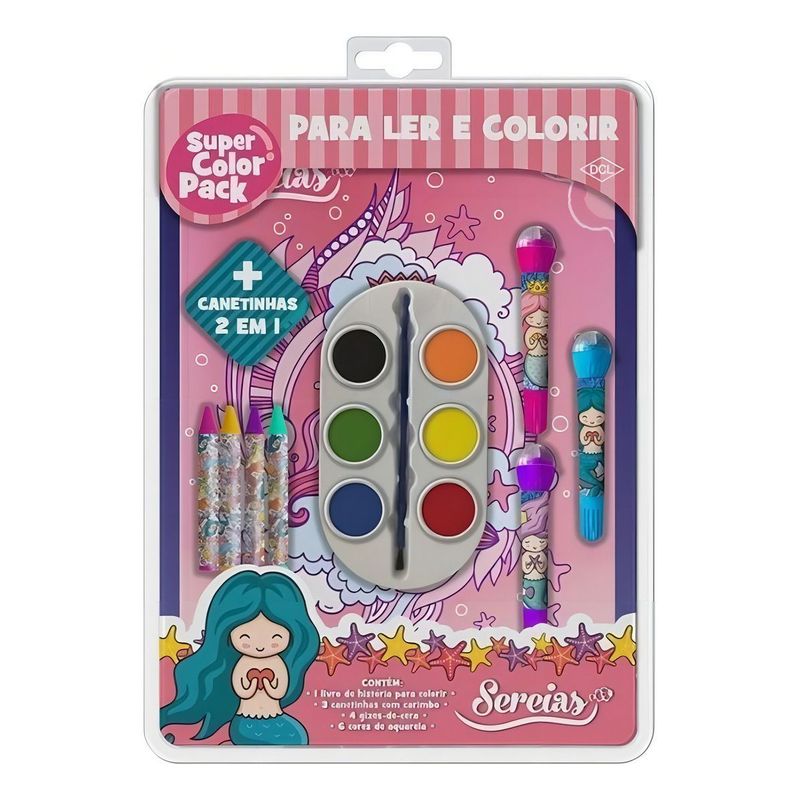 Pinte e borde com as Sereias neste divertido kit. O blister inclui livro para ler e colorir, gizes de cera, paleta de aquarela e canetinhas com carimbos acoplados.