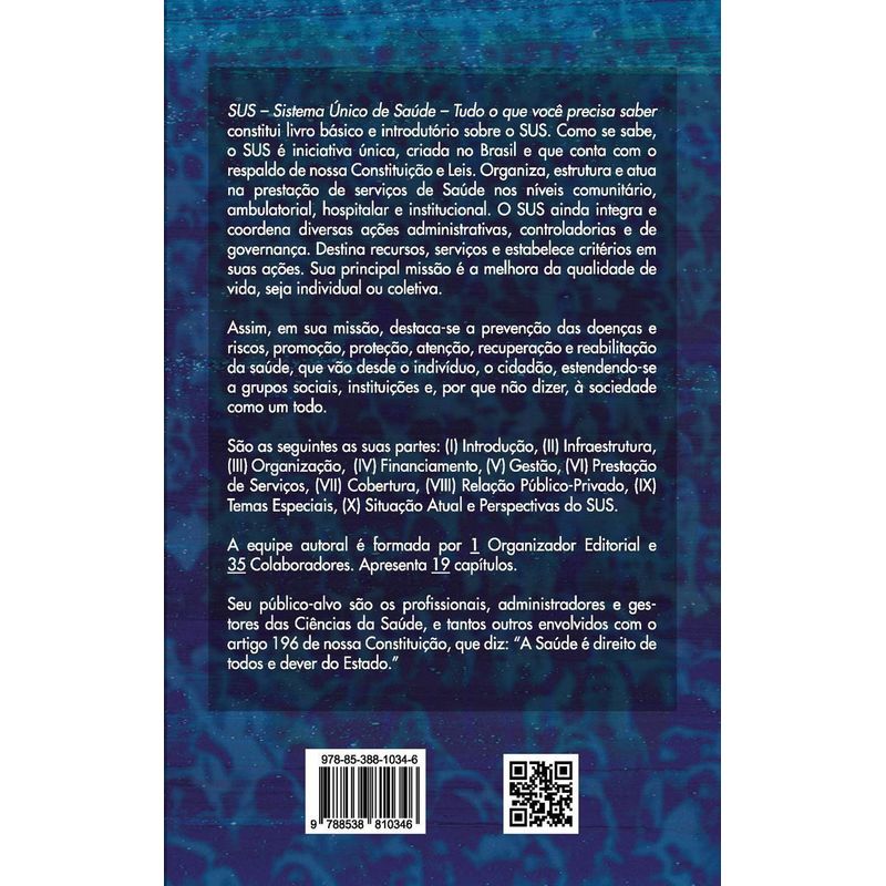 SUS Sistema Unico de Saude – Tudo o Que Voce Precisa Saber constitui livro basico e introdutorio sobre o SUS. Como se sabe, o SUS e iniciativa unica, criada no Brasil e que conta com o respaldo de nossa Constituicao e Leis. Organiza, estrutura e atua na prestacao de servicos de Saude nos niveis comunitario, ambulatorial, hospitalar e institucional. O SUS ainda integra e coordena diversas acoes administrativas, controladorias e de governanca. Destina recursos, servicos e estabelece criterios em suas acoes. Sua principal missao e a melhora da qualidade de vida, seja individual ou coletiva. Assim, em sua missao, destaca-se a prevencao das doencas e riscos, promocao, protecao, atencao, recuperacao e reabilitacao da saude, que vao desde o individuo, o cidadao, estendendo-se a grupos sociais, instituicoes e, por que nao dizer, a sociedade como um todo. Sao as seguintes suas partes: (I) Introducao, (II) Infraestrutura, (III) Organizacao, (IV) Financiamento, (V) Gestao, (VI) Prestacao de Servicos, (VII) Cobertura, (VIII) Relacao Publico-Privado, (IX) Temas Especiais, (X) Situacao Atual e Perspectivas do SUS. A equipe autoral esta formada por 1 Organizador Editorial e 35 Colaboradores. Apresenta 19 capitulos. Seu publico-alvo sao os profissionais, administradores e gestores das Ciencias da Saude, e tantos outros envolvidos com o artigo 196 de nossa Constituicao, que diz: A Saude e um direito de todos e dever do Estado.