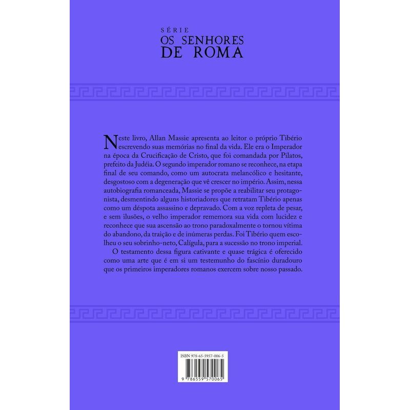 Neste livro, Allan Massie apresenta ao leitor o próprio Tibério escrevendo suas memórias no final da vida. Foi imperador na época da Crucificação de Cristo, que foi comandada por Pilatos, prefeito da pequena Judéia. O segundo no comando do império romano, afilhado de Augusto, governou Roma por quase 23 anos, tendo atuado no comando de legiões romanas e como tribuno, antes de ser nomeado Imperador. Para sua coroação, uma estranha série de mortes de descendentes diretos de Augusto lhe abriram o caminho. Sua larga experiência política garantiu uma sucessão tranquila. No entanto, na etapa final de seu comando, havia se tornado um autocrata melancólico e hesitante, desgostoso com a degeneração que viu crescer no império. Nessa autobiografia romanceada, Massie reabilita seu protagonista, desmentindo alguns historiadores que retratam Tibério apenas como um déspota assassino e depravado. O testamento dessa figura cativante e quase trágica é oferecido como uma arte que é em si um testemunho do fascínio duradouro que os primeiros imperadores romanos exercem sobre nosso passado