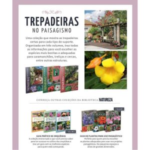 Caramanchões e Arcos Elas são as estruturas mais lúdicas do paisagismo. Veja como usar as trepadeiras nos caramanchões para deixar ainda mais confortável a sala de estar no jardim. Já os arcos podem dar as boas vindas em um bucólico e florido portão. Tudo bem detalhado, ilustrado e com instruções de cultivo. Sobre a coleção Trepadeiras floridas fazem toda a diferença no jardim. São as coringas do paisagismo, pois se agarram e se enrolam em qualquer suporte. A coleção Trepadeiras no Paisagismo, de Valerio Romahn, foi planejada para resolver as principais dúvidas dos jardinistas sobre qual trepadeira usar e em que tipo de estrutura. Organizada em três volumes, fica fácil ver como conduzir as mais belas espécies em caramanchões, treliças e cercas, entre outras estruturas.