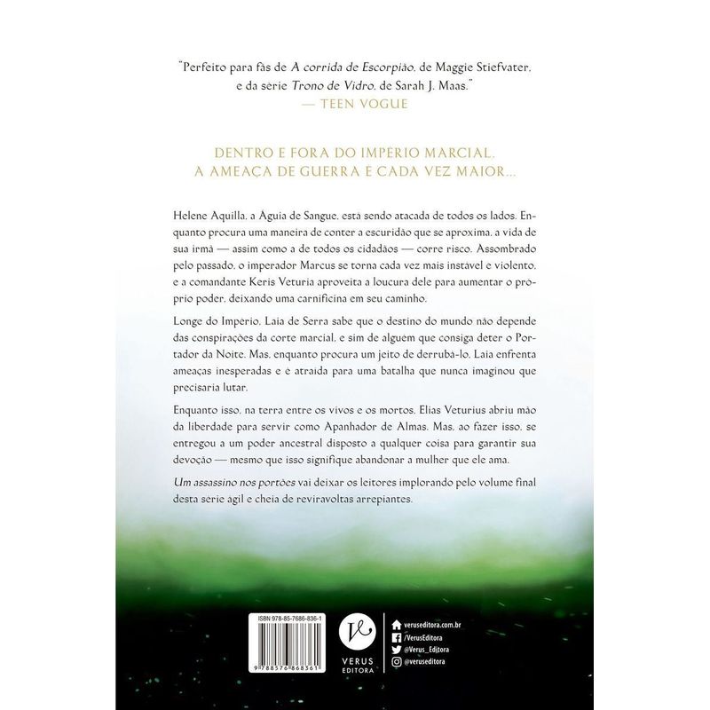 Um assassino nos portões é o terceiro volume da série de sucesso Uma chama entre as cinzas. Dentro e fora do Império Marcial, a ameaça de guerra é cada vez maior…Helene Aquilla, a Águia de Sangue, está sendo atacada de todos os lados. Enquanto procura uma maneira de conter a escuridão que se aproxima, a vida de sua irmã – assim como a de todos os cidadãos – corre risco. Assombrado pelo passado, o imperador Marcus se torna cada vez mais instável e violento, e a comandante Keris Veturia aproveita a loucura dele para aumentar o próprio poder, deixando uma carnificina em seu caminho.Longe do Império, Laia de Serra sabe que o destino do mundo não depende das conspirações da corte marcial, e sim de alguém que consiga deter o Portador da Noite. Mas, enquanto procura um jeito de derrubá-lo, Laia enfrenta ameaças inesperadas e é atraída para uma batalha que nunca imaginou que precisaria lutar.Enquanto isso, na terra entre os vivos e os mortos, Elias Veturius abriu mão da liberdade para servir como Apanhador de Almas. Mas, ao fazer isso, se entregou a um poder ancestral disposto a qualquer coisa para garantir sua devoção – mesmo que isso signifique abandonar a mulher que ele ama.Um assassino nos portões vai deixar os leitores implorando pelo desfecho desta série ágil e cheia de reviravoltas arrepiantes. “Perfeito para fãs de A corrida de Escorpião, de Maggie Stiefvater, e da série Trono de Vidro, de Sarah J. Maas.” – Teen Vogue “Emocionante e difícil de largar; os leitores vão devorar este volume.” – BuzzFeed “O livro trata com habilidade de questões sérias, como os custos do genocídio e da guerra. Cheio de ação e emocionalmente envolvente, Um assassino nos portões é a leitura perfeita.” – The Washington Post “Tahir criou mais uma história irresistível, que desafia os leitores a parar de virar as páginas.” – Booklist “Os fãs da série não vão querer perder este volume eletrizante.” – Bookish