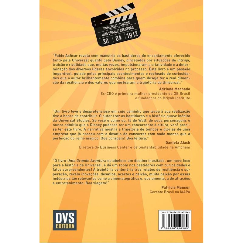 Este é o primeiro livro que aborda a história da Universal Studios e, de imediato, surge uma dúvida inevitável: por que só agora? A verdade é que a Universal passou por uma série de altos e baixos, enfrentou graves crises, reviravoltas, e foi comandada por diversas empresas, inclusive de países diferentes. Infelizmente, durante essas gestões, não houve preocupação com a manutenção de um legado, muito menos com um senso de continuidade. Não é de se espantar que muitas peças estivessem perdidas, mas, aos poucos, o autor, com muita habilidade, conseguiu encontrá-las e reuni-las para montar esse enorme quebra-cabeça que até então ninguém havia ousado fazer. O livro fará você viajar no tempo, retornando ao final do século XIX, antes da fundação da empresa, para entender o que levou ao seu surgimento e como ela chegou até aqui. Histórias que poderiam parecer independentes foram cuidadosamente amarradas, trazendo, de maneira prática e bastante objetiva, fatos pouco conhecidos, informações inéditas e curiosidades surpreendentes, além das pessoas que foram imprescindíveis nessa trajetória. Atualmente, a Universal Studios participa da vida de milhões de pessoas pelo mundo todo, seja através dos filmes e programas de televisão que produz, conteúdos que disponibiliza em canais abertos e fechados, pela internet e por streaming, seja por seus parques temáticos localizados nos Estados Unidos e na Ásia. Porém, pouquíssimas delas realmente sabem como tudo começou. Por isso, se você acha que conhece a Universal, talvez seja melhor reconsiderar. Aceite o convite de embarcar nesta leitura, pois ela certamente será Uma Grande Aventura!