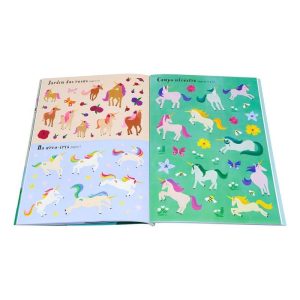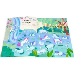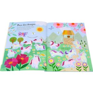 Cole os unicórnios no campo florido, no jardim de rosas, na floresta encantada e em muitos outros cenários mágicos. Desdobre a capa de trás para guardar seus adesivos – você pode colá-los e descolá-los quantas vezes quiser!