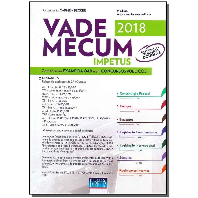 O Vade Mecum é um tradicional aliado dos operadores do Direito. Uma obra que sistematiza a principal legislação vigente em nosso país, tornando-se instrumento indispensável para atender a todas as necessidades de quem se prepara para o Exame da OAB e para concursos públicos. (…) O ano de 2017 nos trouxe intensa produção legislativa com profundas alterações em diversas áreas do Direito. Para a 9ª edição, tivemos o cuidado de incorporá-las, todas, nos devidos textos legais, resultando em um material rigorosamente atualizado para que possamos continuar, com excelência, a facilitar a vida profissional dos operadores do Direito e candidatos a Exames da OAB e concursos públicos. Como diferencial, mantivemos, em cada diploma legal um QR Code, que permitirá acesso imediato, por celular ou tablete, às fontes legislativas para pesquisa e atualizações. Promovemos ampla revisão e atualização de todo o Vade Mecum, com a introdução de novas remissões e substituição de índices alfabético-remissivos dos Códigos. Contamos agora com anexo com todos os enunciados das Jornadas do Conselho da Justiça Federal. (…) Todas as demais alterações ocorridas neste ano foram acrescentadas aos Códigos e legislação complementar, e, na parte de jurisprudência, tivemos a introdução de todas as novas súmulas dos Tribunais Superiores, com a alteração das já editadas, e das Súmulas do Conselho Pleno e Órgão Especial da OAB.