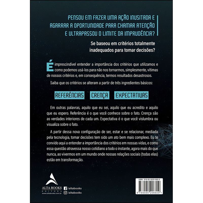 É imprescindível entender a importância dos critérios que utilizamos e como podemos usá-los para não nos tornarmos, simplesmente, vítimas de nossos critérios e, em consequência, termos resultados desastrosos. Saiba que os critérios se alteram a partir de três ingredientes básicos: REFERÊNCIAS, CRENÇA E EXPECTATIVAS. Em outras palavras, aquilo que eu sei, aquilo que eu acredito e aquilo que eu espero. Referência é o que você conhece sobre o fato. Crença são as verdades interiores de cada um. Expectativa é o que você vislumbra ou visualiza sobre o fato. A partir dessa nova configuração de ser, estar e se relacionar, mediada pela tecnologia, tomar decisões tem sido um ato bem mais complexo. Eu te convido aqui a entender a importância dos critérios em nossas vidas, e como essa questão atravessa nosso cotidiano a todo o instante, agora mais do que nunca, ao vivermos em um mundo onde nossas relações sociais (todas elas) estão em transformação. Há falta de critérios na ação e na reação perante as novidades que nos chegam em ritmo frenético. É como se de repente a quantidade de decisões gerasse uma indigência crítica e míope da realidade, com falta de nexo em quase tudo. Temos hoje muito mais liberdade e multiplicidade de opções, mas esse grau exponencial de liberdade trouxe como consequência a necessidade de se tomar decisões sobre tudo, o tempo todo. E isso cria toda uma nova geração que pode ser considerada vítima do próprio critério. A partir dessa nova configuração mediada pela tecnologia, tomar decisões tem se tornado um ato bem mais complexo. Como as situações em que vivemos ganharam novas nuances, saber gerenciar o tempo demanda sabedoria e um intenso exercício de autonomia, mas, como estamos atolados pelas pendências cotidianas, acabamos desconhecendo ou não tendo um critério adequado para usar quando somos chamados a decidir. Essa inversão de mais liberdade de ação e coerção de opinião gera um novo mundo que altera premissas e exige revisões profundas em toda a sociedade. Diante disso, resta a questão: De que maneira podemos guiar nossas ações pelo uso adequado dos critérios que temos e tomar decisões acertadas? Em Vítimas do Critério, você encontrará a resposta.